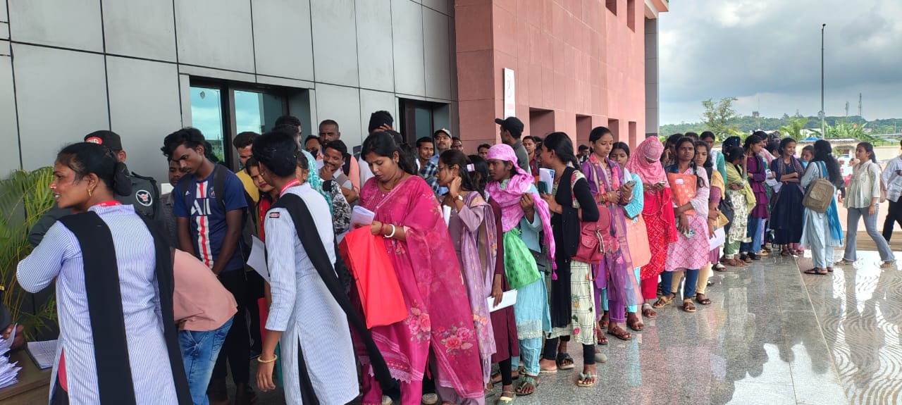 डिमरापाल सुपर स्पेशियलिटी हॉस्पिटल में 27 और 28 सितंबर को भर्ती प्रक्रिया का आयोजन किया गया, जिसमें बस्तर के बेरोजगार युवाओं ने बढ़-चढ़कर भाग लिया। इस दो दिवसीय भर्ती शिविर में युवाओं ने कतार में खड़े होकर अपने आवेदन जमा किए और अपनी बारी का इंतजार किया। अस्पताल में विभिन्न पदों पर भर्ती के लिए आवेदन आमंत्रित किए गए थे, जिसमें बस्तर एवं आसपास के युवाओं ने उत्साहपूर्वक भाग लिया।दो दिवसीय भर्ती शिविर भर्ती प्रक्रिया में युवाओं को अपने आवेदन जमा करने और साक्षात्कार का अवसर मिला। बस्तर के बेरोजगार युवाओं ने इस भर्ती प्रक्रिया में बढ़-चढ़कर भाग लिया और अपने भविष्य को संवारने का अवसर प्राप्त किया। भर्ती प्रक्रिया के माध्यम से सुपर स्पेशियलिटी हॉस्पिटल डिमरापाल में विभिन्न पदों पर योग्य उम्मीदवारों की नियुक्ति की जाएगी। जिससे अस्पताल की सेवाओं में और अधिक सुधार होगा और बस्तर क्षेत्र के लोगों को बेहतर स्वास्थ्य सुविधाएं मिलेंगी। इस भर्ती प्रक्रिया के माध्यम से बस्तर के युवाओं को रोजगार के अवसर प्रदान किए जाएंगे और सुपर स्पेशियलिटी हॉस्पिटल डिमरापाल में योग्य उम्मीदवारों की नियुक्ति की जाएगी।